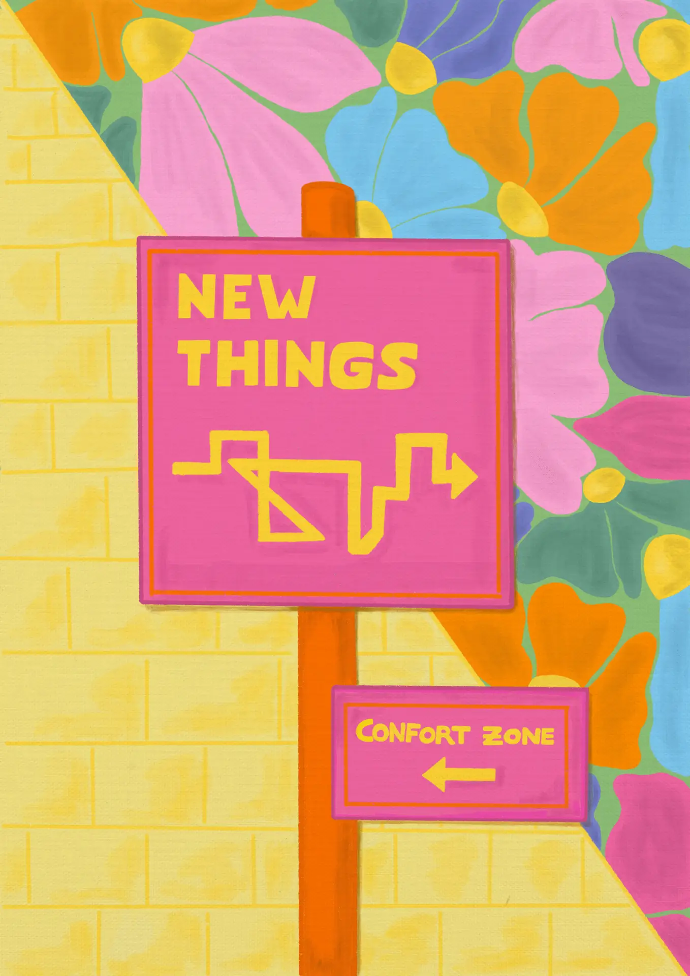 A un lado, el camino seguro, predecible, plano: la zona de confort donde todo está bajo nuestro control. Al otro, un tentador cartel que promete “nuevas cosas”, nuevas versiones de nosotras mismas. Pero el sendero no es recto, no es simple, no tiene un solo trazo. Una vez lo tomas, el camino se vuelve irregular, lleno de giros, dudas, retrocesos, saltos.